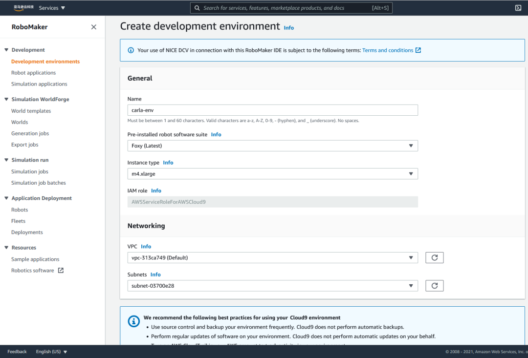 将您的环境命名为 carla-env,选择 Foxy (Latest)[Foxy (最新)] 作为 ROS 发行版,选择 m4.xlarge 作为实例类型,然后单击 Create (创建)。