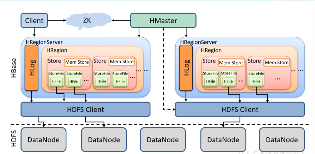 为了方便后面介绍 HBase 迁移的步骤,以及确保迁移过程中避免数据丢失,需要先了解 HBase 的架构和数据文件,来看存储在 HDFS 上的 HBase 的架构图:
