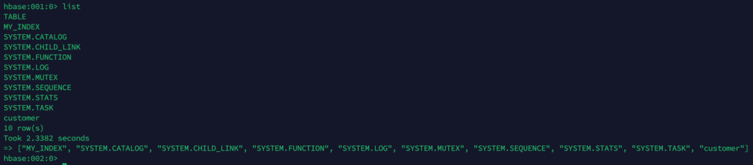 建立二级索引后,我们可以看到 HBase 里多了这样几张表,如下图: