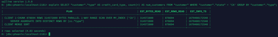 我们可以执行命令 ”/usr/lib/phoenix/bin/sqlline.py localhost:2181” 进入 Phoenix 执行环境,然后检查执行计划如下: