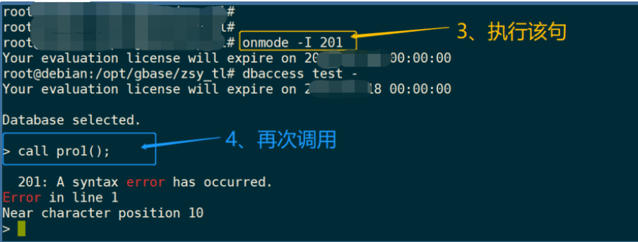 这里用方法三解决问题:执行onmode -I 201,201为上图报错语句的错误号,并再次调用pro1。