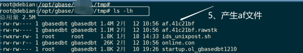 执行完上述操作,进到数据库实例安装路径下的tmp目录中,cd $GBASEDBTDIR/tmp,会看到af前缀文件。