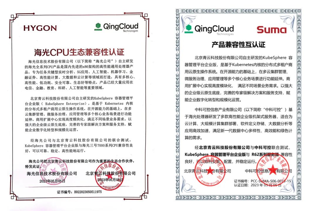 近日,青云科技自主研发的 KubeSphere 容器平台企业版分别与海光三号 7000 系列 CPU、中科可控 R62 系列服务器完成产品兼容性互认证。
