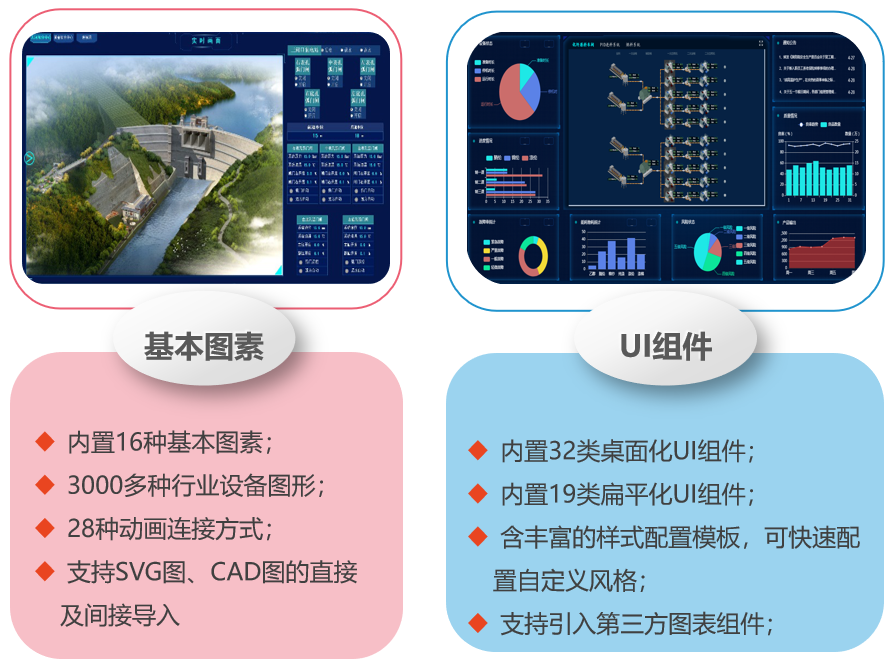 各类开源图表组件扩展 内嵌100+图表 内置6种组态图表 报警窗、事件窗、趋势曲线、柱状图、饼图、XY曲线; 支持自定义图表组件 支持扁平化组件19类(ElementUI) 支持桌面化组件32类(EasyUI) 支持接入其他第三方控件