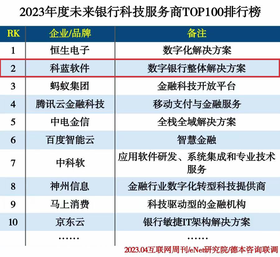 近日,德本咨询、eNet研究院、《互联网周刊》联合发布了“2023未来银行科技服务商100强”榜单,科蓝软件凭借在数字银行和智慧银行领域的突出实力及专业化交付能力,成功登榜第二名。