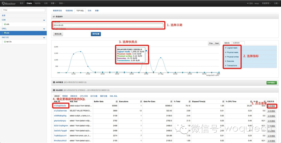 自动解析AWR报告,根据Logical reads、Physical reads、Physical writes、Executes和Transactions等指标绘制曲线,找出业务高峰点;