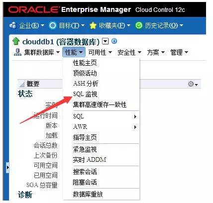 进入到clouddb1数据库后,选择【性能】下的SQL监视功能。
