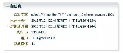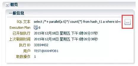 一般信息部分显示了SQL执行的一些基本的细节,例如SQL的文本,SQL语句采用的并行度,SQL的执行开始时间,本次统计值最后一次的刷新时间,执行SQL的用户、取数操作等。注意【SQL文本】后带有…的标记(红色框标记),点击它,你会获得完整的SQL语句文本,从版本11.2.0.2开始,你还会看到绑定变量的值。