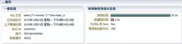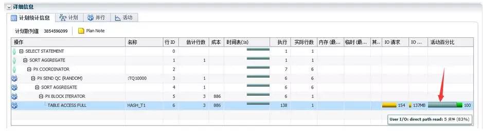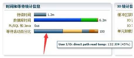 这一部分内容非常少,但是信息量非常大,显示的是持续时间、数据库时间和等待活动百分比。把鼠标移动到数据库时间的条状图上,会看到消耗在各类等待事件和CPU上的时间,这让你知道你的SQL时间都花哪了,是IO操作多,还是CPU操作多,这非常的棒。等待活动百分比条状图则显示了详细的等待事件分布,例如上图中蓝色部分代表整个语句执行过程中,45%的等待发生在direct path read temp这个等待事件上,注意这里等待活动百分比条状图的100(100%)指的是数据库里的等待事件时间,而不是整个数据库时间,即并不包括CPU时间,这部分的信息可以告诉DBA在SQL执行过程中,遭遇了哪些等待事件,以及这些等待事件占取的比例,当然,你应该关注这些等待事件里最为惹眼的。