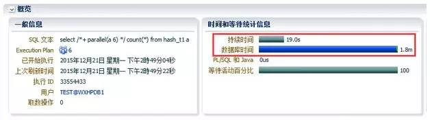 这个语句的持续时间只有19秒,而数据库时间则有1.8分钟,从【一般信息】的Execution Plan部分可以看到这个语句是以并行度6来运行,这意味着数据库里有多个进程同时服务于这个查询,所有这些会话的数据库时间加上协调进程的时间都被汇总到了数据库时间中。数据库时间代表着大致有多少时间必须在数据库中完成,但是因为该语句是并行的,因此你其实不必等待那么长的时间。