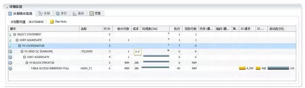 详细信息页本身包含了一些子tab页面,例如上图中包含了【计划统计信息】、【计划】、【并行】、【活动】、【度量】子tab页。详细信息页主要包含了执行计划在在行源(rowsource)细节上的一些统计信息。
