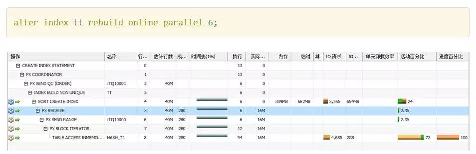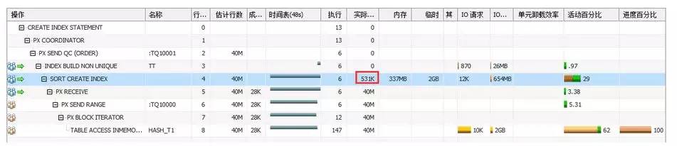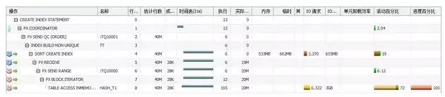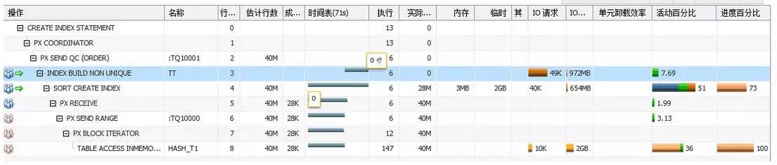 从上图可以看出,向右的箭头处于排序创建索引阶段(行源3,4,5),全表扫描阶段已经结束,正在进行排序和创建索引,根据【实际行数】列可以知道目前排序已经完成的行数是531K,而真正需要的排序量为47M,从其他行源可以知道需要排序的总量(ID=5-8的实际行数列都显示了这个信息)。接下来的工作就是刷新页面看排序的实际行数什么时候能够到47M了。【进度百分比】列显示了已经完成的百分比,这个对于工作量的估算非常的有意义。有一点比较遗憾,【进度百分比】对于很多操作都不能进行显示,很多时候【进度百分比】会在SQL运行过程中动态出现。不过对于索引创建来说,这个并不重要,根据真正的数据量和已经完成的排序量就能大概知道剩余的工作量。