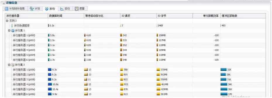 我们来看【详细信息】 的【并行】tab页,这个页面汇集了每一个并行进程完成的工作,由于ORACLE的并行采用了生产者消费者模型,首先是按照实例做的分组,然后再按照生产者和消费者把进程做了分组,我的测试例子里,只有一个RAC节点实例,另一个节点被关闭了。