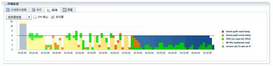 切换到【详细信息】的【活动】页,展示了从开始执行到结束执行时间跨度内,有多少进程处于活跃状态。由于我们设置了并行度6,因此可以从页面上看到SQL执行的后期大部分时间有6个进程处于活跃状态。