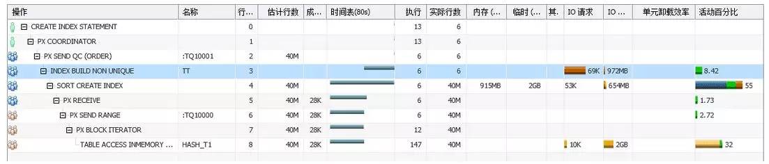 再次刷新,发现索引创建已经完成,因为最左边的已经没有向右的箭头,而且实际行数(行源4)已经为47M,完成了所有数据的排序。我们观察【活动百分比】这一列,整个索引创建过程中,绝大部分的时间都消耗在ID=4这个行源上,即排序和创建索引操作上,从【时间表】(Timeline)列也可以看出它的活跃时间跨度也最长。