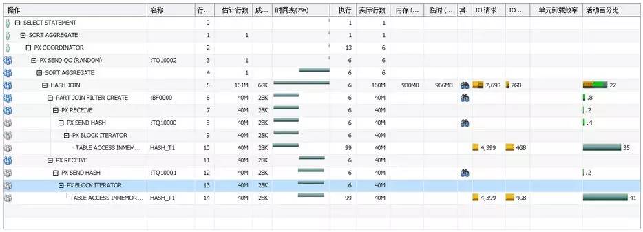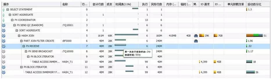 查看执行计划发现数据分发方式已经变为PX SEND HASH,使用了HASH分发的方式,观察【实际行数列】数据量也和表的记录数相同,临时表空间也从4GB大小缩减为966MB。HASH JOIN操作本身占取的活动百分比也从51%下降为22%。
