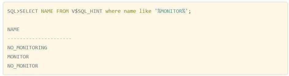 可以使用提示MONITOR和NO_MONITOR来控制对一个语句的监控与否。如果你对某一个运行时间比较长的SQL不想做监控,可以使用NO_MONITOR这个HINT。需要注意有一个跟NO_MONITOR非常相像的HINT NO_MONITORING,它是与SQL MONITORING功能完全不相关的东西,通过NO_MONITORING这个HINT可以禁止对表里先关字段的谓词使用情况进行监控,这些监控数据会被放入到sys.col_usage$中。