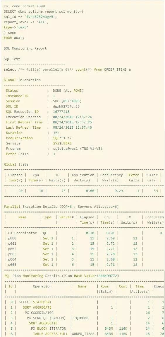 经过上面一系列的介绍,我们再来看通过SQL包获取SQL MONITORING的输出就变得极为简单,这里我不会再花费笔墨来对输出做详细的解释,大部分的信息上面我都已经讲到过了。
