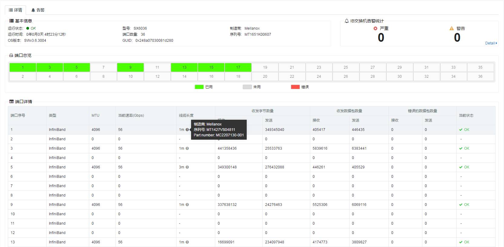 在QData v5.0.0中,还提供了对可管理的IB交换机的监控,用户可以通过页面查看IB交换机的基本信息,每一个端口的状态,以及每条IB线缆的详细信息,迅速掌握QData一体机中整个IB网络的运行状态。