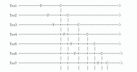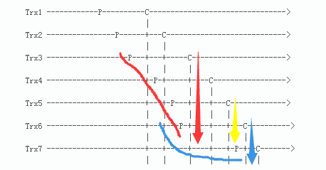 由图可见,Trx5 和 Trx6可以并发执行,因为他们的commit-parent是相同的,都是由Trx2设定的。但是, Trx4和Trx5不能并发执行, Trx6和Trx7也不能并发执行。