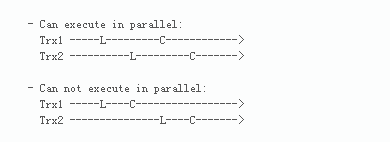 假设有两个事务:Trx1、Trx2。Trx1先于Trx2。那么,当且仅当Trx1、Trx2的lock interval有重叠,则可以并行执行。