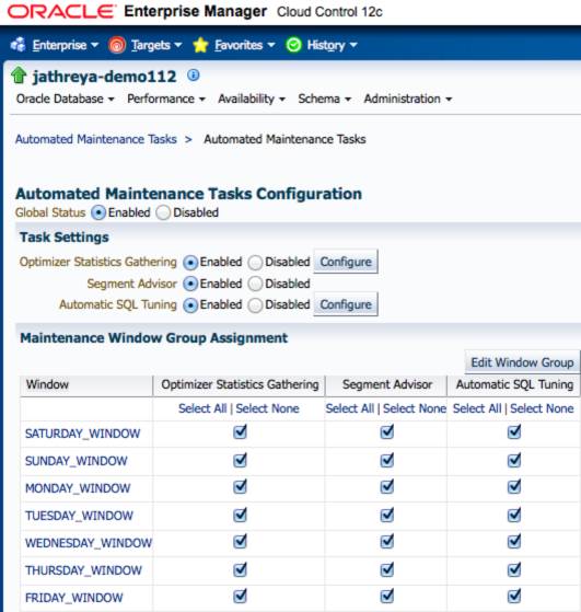 Oracle会在预定义维护窗口期间 (工作日10pm 到2am 和周末6am 到2am )收集数据库中所有缺失统计信息或者统计信息过期对象的统计信息,您可以在Oracle企业管理器或使用DBMS_SCHEDULER和DBMS_AUTO_TASK_ADMIN软件包来更改维护窗口。