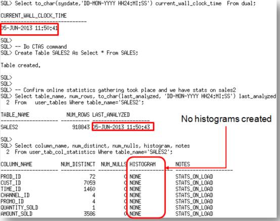 图4:在线收集统计信息为新创建的sales2表提供表和列的统计信息收集