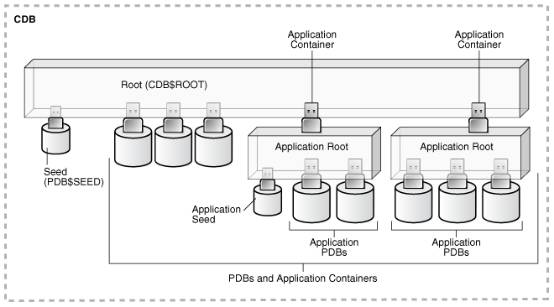 在Oracle Database 12c R2版本中,Oracle带来新的Application Containers特性,该特性对原有的多租户功能进行了增强,在CDB root容器中可以创建一个叫做Application root的容器,类似于CDB root,可在其内创建多个依赖于Application root的Application PDBs,其架构图如下: