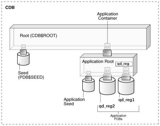 在Application Container特性下还有另一个概念,被命名为“Application”,我们可以把“Application”理解为一个区域,“Application”只能创建在Application root中,其内可以创建表、视图、函数等公共对象,然后可在Application PDBs中使用sync同步命令,来实现“Application”内的公共对象共享到Application PDBs中。