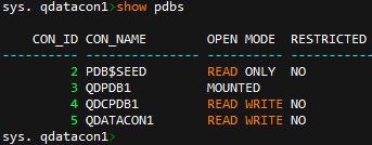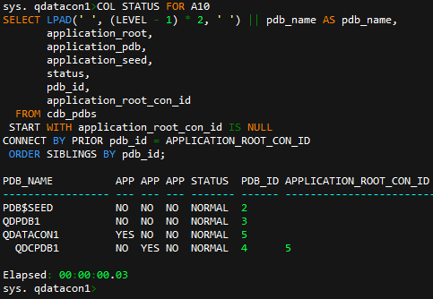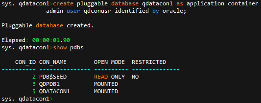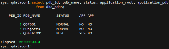 这样一个名为qdatacon1的Application root就已经成功创建 ,可以通过视图dba_pdbs.application_root字段查看是否是Application root,如下: