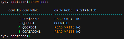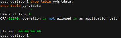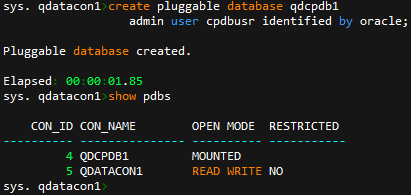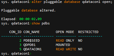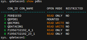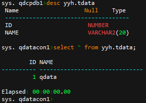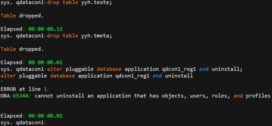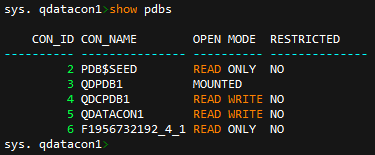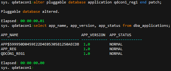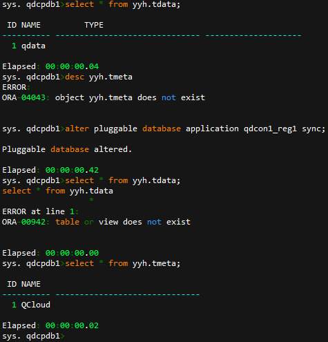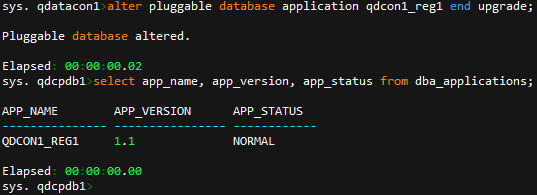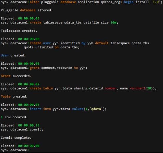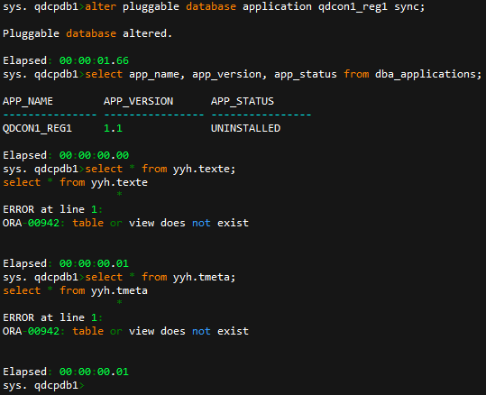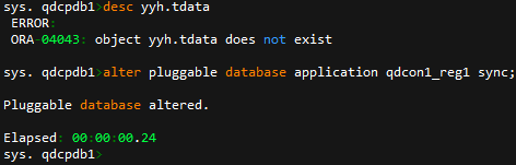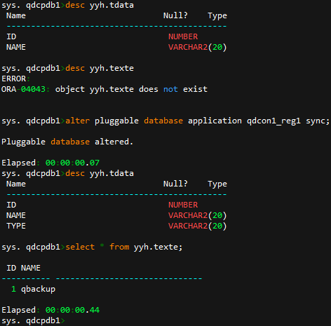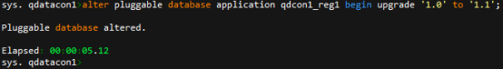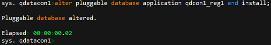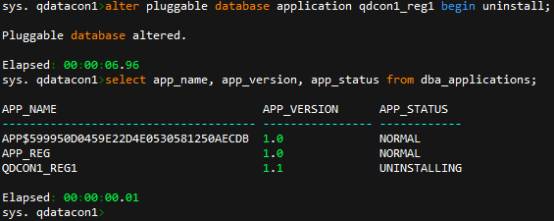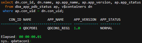 可以看到qdcon1_reg1已经安装完成,安装完成后qdcon1_reg1中的公共对象会以特定的方式被共享到相应的Application PDB中,如下:
