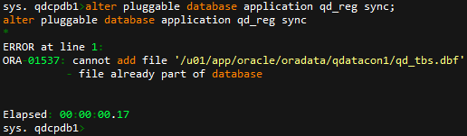 注意,当在使用Application Containers特性时需要使用数据文件的OMF的管理方式,虽然在不使用OMF管理时依然可以成功创建Application root以及Application PDBs,但当“Application”内包含表空间后,在Application PDBs中进行同步“Application”时会报ORA-01537错误,无法将“Application”内的表空间同步到Application PDBs中。错误代码如下: