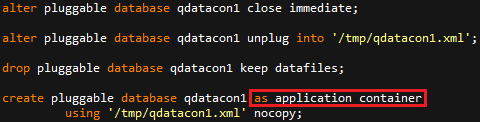 Application root的基本管理与普通的PDB基本上没有区别, 包括Application root的cloning/unplug/plugin等。但需要注意as application container的使用,比如下面unplug/plugin的过程: