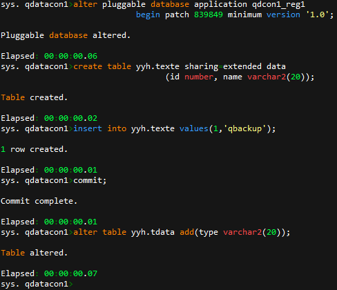 在上面的小结中,当我们使用end install子句将“Application”封闭后,如果想再次在“Application”中创建对象(table/view/packages/sequence等),以及对“Application”内已经存在的对象进行alter操作时,我们可以使用patch子句对现有的“Application”进行修补操作。
