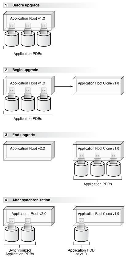 对“Application”我们可以使用patch来对其进行修补操作,但修补操作只限添加/更改等,无法对已经存在“Application”中的公共对象进行删除操作,如果我们想对公共对象进行删除操作,可以使用UPGRADE子句对现有的“Application”进行升级,在升级的过程中,Oracle会首先自动创建Application root的Clone版本,Clone版本创建完成后,Application PDBs将指向Clone版本的Application root,“Application”将继续执行升级操作,升级完成之后,Application root的Clone版本将继续被保留,并且为不同步“Application”的Application PDB提供服务,同步“Application”后的Application PDB将指向升级后的Application root。