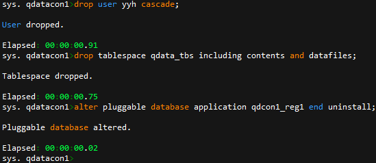 因为对象并没有全部删除,导致end uninstall失败,下面继续drop用户和表空间: