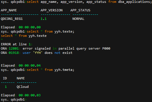 表texte是extended data-linked方式,数据存储在Application root的qdata_tbs中,因为qdata_tbs已经被删除,所以在qdcpdb1中查询时报错,而tmeta为metadata-linked方式,数据存储在本地,所以可以在未做同步时可以查询。
