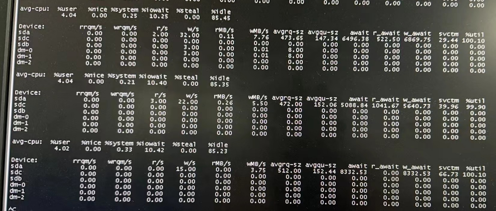查看机器资源,CPU/磁盘长时间100%,其中磁盘的await高于100ms. 如下是一个awai达到5秒以上的例子。
