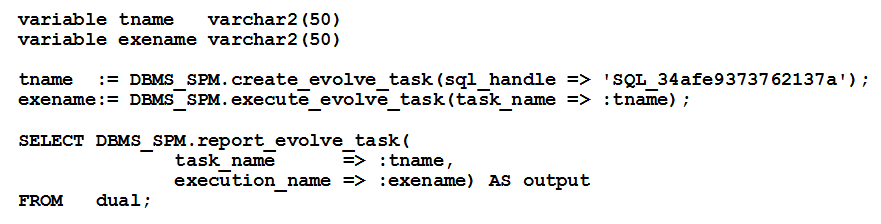 演变的结果都会被记录在数据字典中,可以在任何时候使用dbms_spm.report_evolve_task查看这些信息。