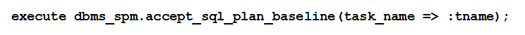 当手动调用SPM发展顾问,未被接受的计划并不会自动被接受,即使已经达到性能要求。计划必须手工使用DBMS_SPM.ACCEPT_SQL_PLAN_BASELINE过程来完成接受操作。演进报告包含详细的接受这些计划说明,包括特定的语法。