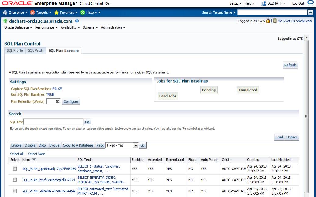 在页面的顶部,点击SQL计划基线表显示SQL计划基线的子页面。