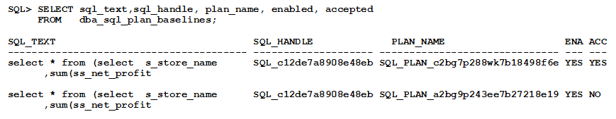 在图8的示例中,同一SQL语句在SQL计划基线中有两个计划。两个计划都是自动捕捉的,但是只有计划(SQL_PLAN_c2bg7p288wk7b18498f6e)会被使用,另外一个是未被接受的计划。这意味着它一直不会被使用除非它已经被验证过。