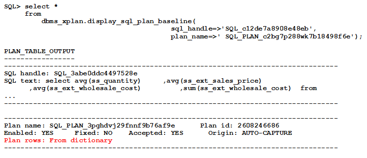 捕获实际的执行计划确保如果SQL计划基线从一个系统转移到另一个系统,SQL计划基线中的计划仍然可以被显示,即使其中的一些对象或解析模式本身不存在于新系统上。这意味着即使不能执行,也可以显示计划。