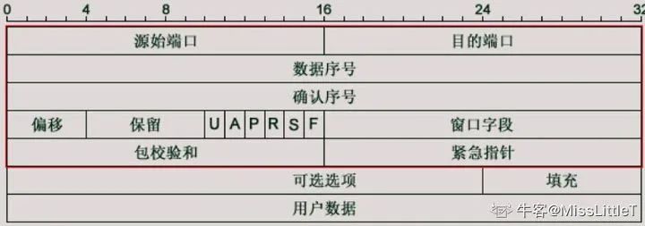 源端口号(16位)和目的端口号(16位):再加上 ip 首部的源 ip 地址和目的IP地址可以唯一确定一个 TCP 连接。 数据序号(16位):表示在这个报文段中的第一个数据字节序号。 确认序号:仅当ACK标志为 1 时有效,确认号表示期望收到的下一个字节的序号。 偏移:就是头部长度,有 4 位,跟 ip 头部一样,以 4 字节为单位。最大是 60 个字节。 保留位:6 位,必须为 0。 6 个标志位:URG-紧急指针有效;ACK-确认序号有效;PSH-接收方应尽快将这个报文交给应用层;RST-连接重置;SYN-同步序号用来发起一个连接;FIN-终止一个连接。 窗口字段:16 位,代表的是窗口的字节容量,也就是TCP的标准窗口最大为2^16 - 1 = 65535个字节。 校验和:源机器基于数据内容计算一个数值,收信息机要与源机器数值结果完全一样,从而证明数据的有效性。检验和覆盖了整个的 TCP 报文段:这是一个强制性的字段,一定是由发送端计算和存储,并由接收端进行验证的。