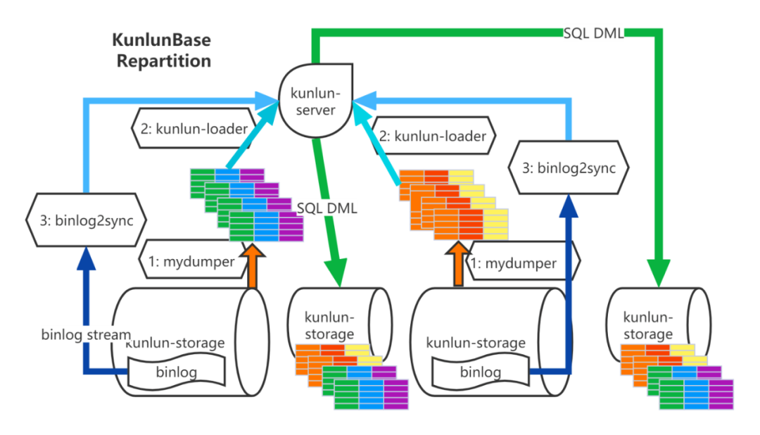 导出表全量数据:node_mgr 调用mydumper 将源表数据 dump 出来并传输数据文件到计算节点所在服务器; 加载表全量数据:node_mgr调用kunlun_loader工具把源表dump全量数据灌入目标表中; binlog catch-up:node_mgr根据dump时各个shard上binlog起始位置记录调用binlog2sync工具,binlog2sync 工具从该位置点开始dump binlog事件; rename 源表和目标表:binlog2sync工具快速将剩余的binlog同步完,然后再将目标表rename成源表名,业务恢复正常使用。