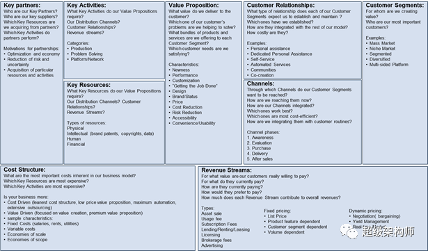 在业务模型的早期历史中,定义业务模型类型是非常典型的,但是,这些类型通常只描述业务的一个方面,通常只描述收入模型。因此,最近关于商业模式的文献集中于描述作为一个整体的商业模式而不是一个元素。受“商业模式画布”框架的启发,商业模式设计应包括对以下关键要素的描述: