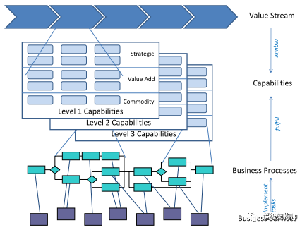 在高层(从第 1 层到第 2 层),能力模型代表组织的 5-10 个主要通用能力,它们通常与高层过程模型重叠或与高层产品组重叠。层次结构第 3 级以下的功能主要用于将模型连接到流程和技术。