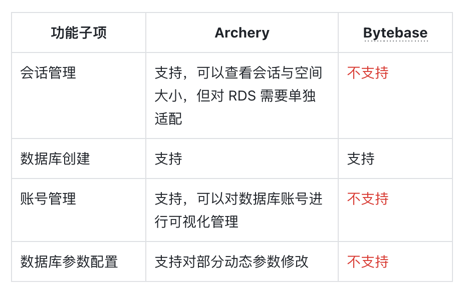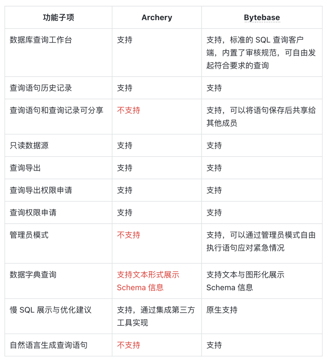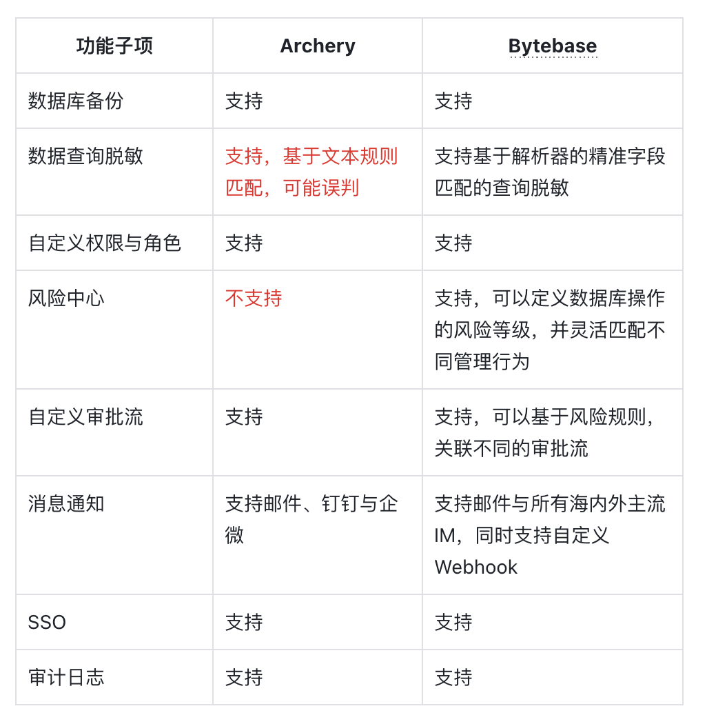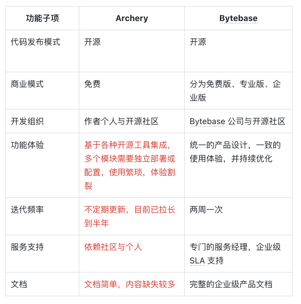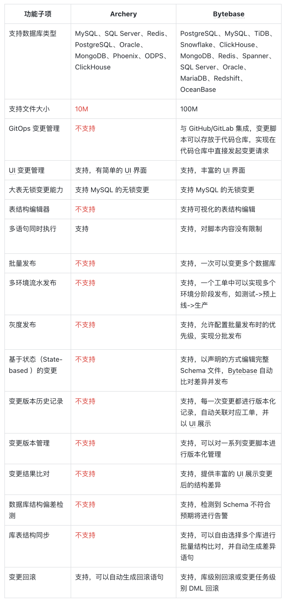 Bytebase 和 Archery 都提供了数据库版本控制和变更的能力,但两者在产品定位,产品形态,管理功能和使用方法上等方面都有较大的差异,上文对这两个工具进行了多维度比较。
