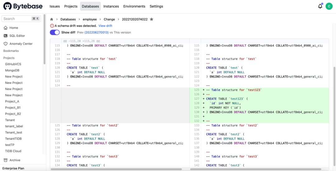 清晰的可视化差异对比,同时可以查看变更后的完整表结构。