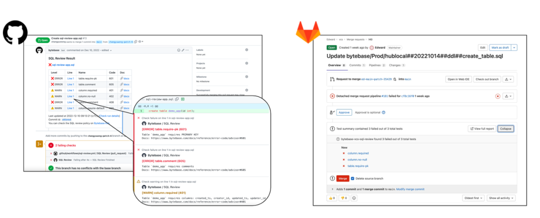 可以在GitLab/GitHub 提交代码时开发者进行 SQL 预审核。